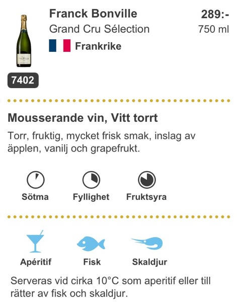 En enklare blanc de blancs som jag gärna dricker igen som aperitif. Ett vin som gästerna uppskattade.