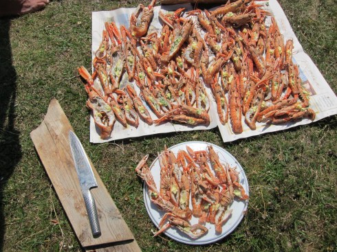 På fotot pekar Sandra på en korg vilda ostron (den röda korgen), resten är odlade. De vilda i korgen var stora som nävar. Undrar hur de ser ut inuti?